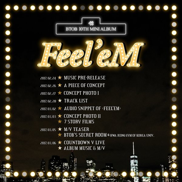 오픈 된 스케줄 티저에 따르면 오는 24일 선공개곡이 공개되고 26일부터 순차적으로 콘셉트 이미지 조각, 콘셉트 이미지, 트랙리스트, 앨범 프리뷰, 두 번째 콘셉트 이미지, 7개의 스토리 필름, 뮤직비디오 티저, 세 번째 공식 팬미팅 '비투비 시크릿 룸'이 진행되고 3월 6일 카운트다운 V라이브와 열 번째 미니앨범 '필름(feel'eM)'의 음원과 뮤직비디오가 공개될 것임을 예고했다.