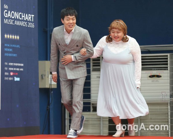 개그맨 김민기(왼쪽)과 개그우먼 홍윤화가 22일 오후 서울 잠실 실내체육관에서 열린 '제6회 가온차트 뮤직어워즈'에 참석하고 있다.