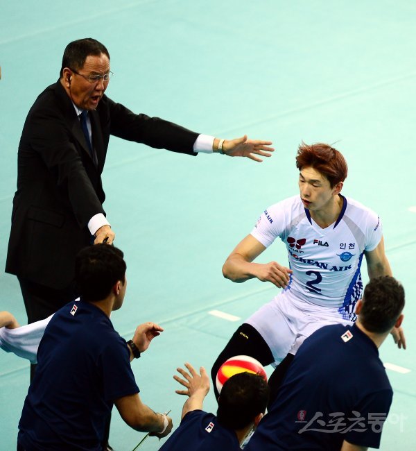 22일 인천 계양체육관에서 ‘2016-2017 NH농협 V리그’ 인천 대한항공과 서울 우리카드의 경기가 열렸다. 대한항공 한선수가 수비를 위해 벤치로 향하자 박기원감독이 선수의 부상을 걱정하고 있다.