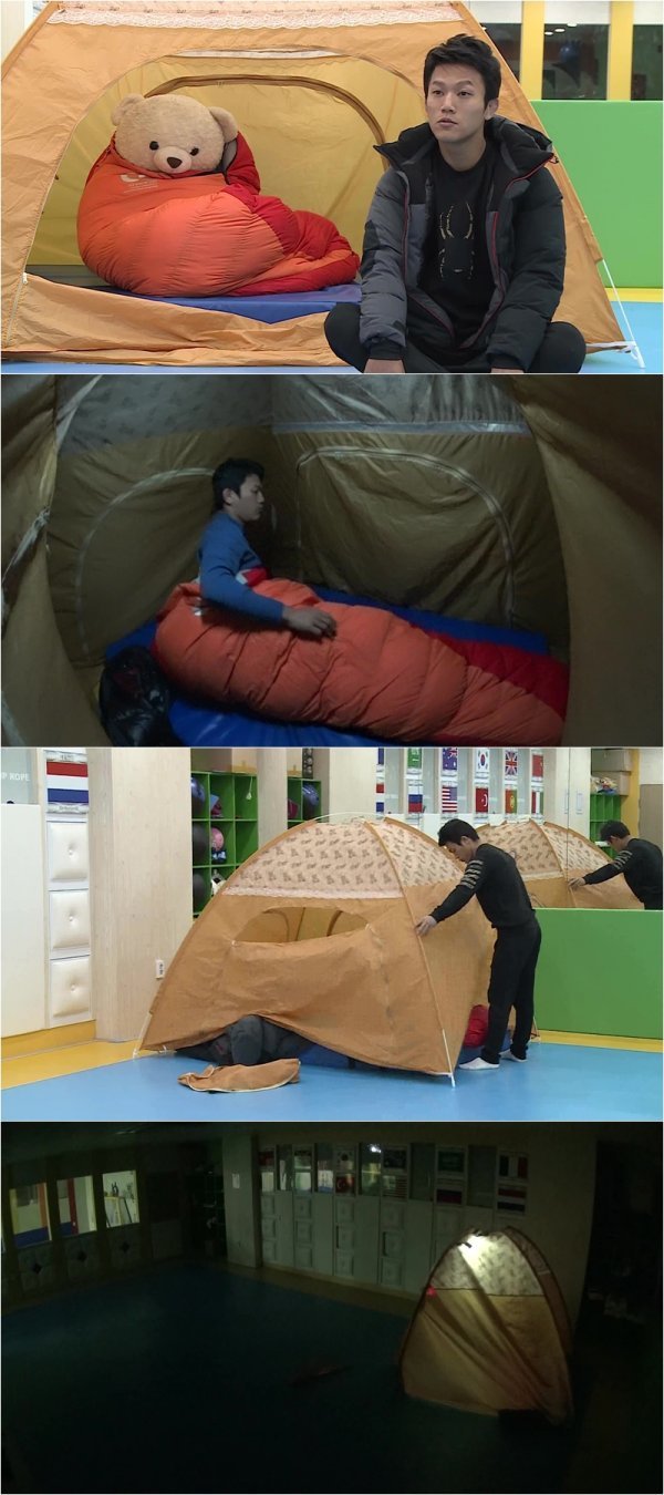 공개된 스틸 속 조준호는 침낭에서 잠이 덜 깬 듯한 표정을 하고 있고, 침낭과 하나 된 그의 모습은 ‘굼벵이’를 연상시킨다. 그가 체육관 한 켠에서 자연스럽게 텐트를 설치하고 있어 눈길을 끄는 가운데, 유도 매트-방한 텐트-침낭으로 완성한 아늑한 침실도 함께 공개돼 시선을 강탈한다.