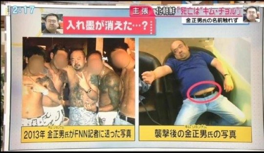 비교된 사진을 보면 일본 후지TV가 보도한 사진에는 김정남의 상반신 전반에 문신이 있지만, 말레이시아 언론이 공개한 사진에는 배 부분에 문신을 찾을 수 없다.