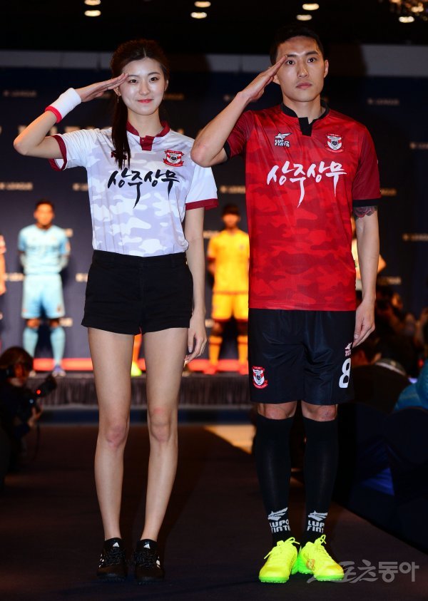 K리그 12개 구단 선수 및 감독들이 참석한 가운데 23일 서울 논현동 파티오나인에서 ‘2017 K리그 클래식 미디어데이’가 열렸다. 상주상무 신진호가이 모델과 함께 유니폼 패션쇼를 펼치고 있다. K리그는 오는 3월 4일에 개막한다.
