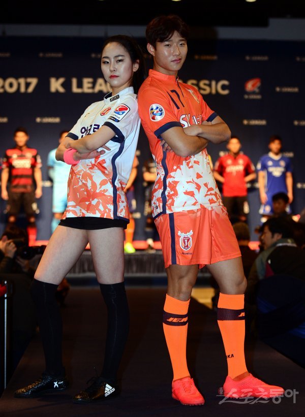 K리그 12개 구단 선수 및 감독들이 참석한 가운데 23일 서울 논현동 파티오나인에서 ‘2017 K리그 클래식 미디어데이’가 열렸다. 제주유나이티드 안현범이 모델과 함께 유니폼 패션쇼를 펼치고 있다. K리그는 오는 3월 4일에 개막한다.