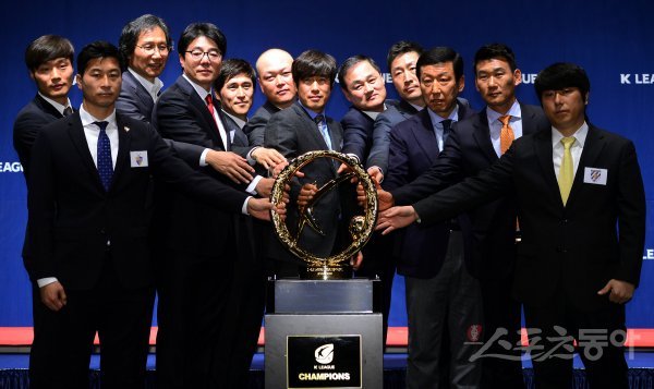 K리그 12개 구단 선수 및 감독들이 참석한 가운데 23일 서울 논현동 파티오나인에서 ‘2017 K리그 클래식 미디어데이’가 열렸다. 12개구단 감독들이 우승 트로피를 앞에두고 기념촬영을 하고 있다. K리그는 오는 3월 4일에 개막한다.