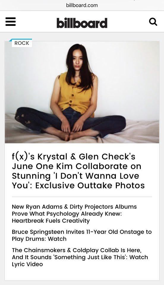빌보드는 ‘f(x)의 크리스탈과 글렌체크의 김준원이 놀라운 콜라보레이션을 선보였다’는 제목으로 이번 두 사람의 아트 콜라보 'I Don`t Wanna Love You’의 음악과 뮤직비디오에 대해서 자세히 다루면서, 아직 공개되지 않았던 미공개 사진들을 독점적으로 공개했다. 덧붙여 ’예술적인 비주얼 아트가 크리스탈의 새로운 영역을 선보였다(The artistic visual marks new territory for Krystal)’고 평했다. 이번 소식은 한때 빌보드 메인에 소개되기도 했다.