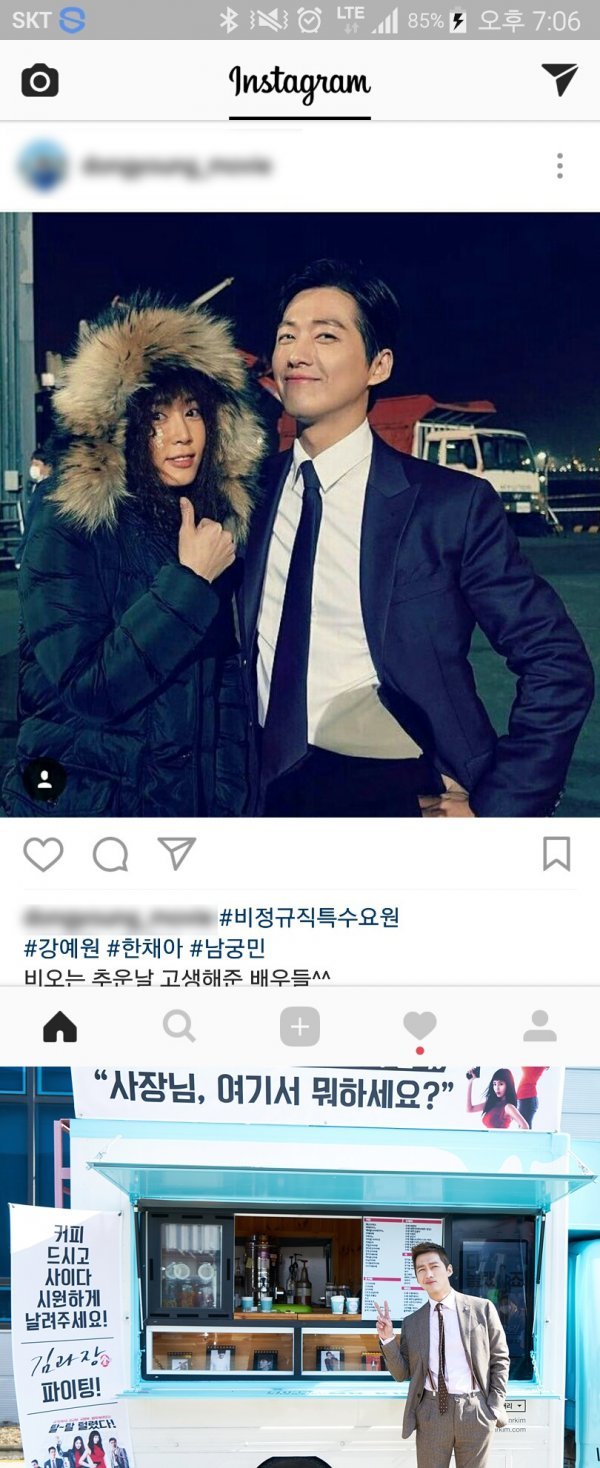 ‘비정규직 특수요원’에서 국가안보국 댓글알바 ‘영실’역의 강예원과 경찰청 미친X로 파격 변신한 ‘정안’역의 한채아가 지난 20일 남궁민과의 인연으로 KBS 드라마 ‘김과장’ 촬영 현장에 따뜻함이 넘쳐나는 커피차를 선물했다. 영화 속 두 배우가 잠복수사를 펼치는 보이스피싱 회사의 미스터리한 사장님이 삥땅전문 김과장으로 변신했다는 소식에 아낌없는 마음을 담은 의리의 선물을 보낸 것이다. 강예원과 한채아는 커피차 메뉴를 직접 고르는 것은 물론 촬영에 방해가 되지 않도록 커피차 시간까지 꼼꼼히 체크하는 등 세심한 배려를 보여 남궁민과 ‘김과장’ 팀에게 큰 감동을 선사했다.