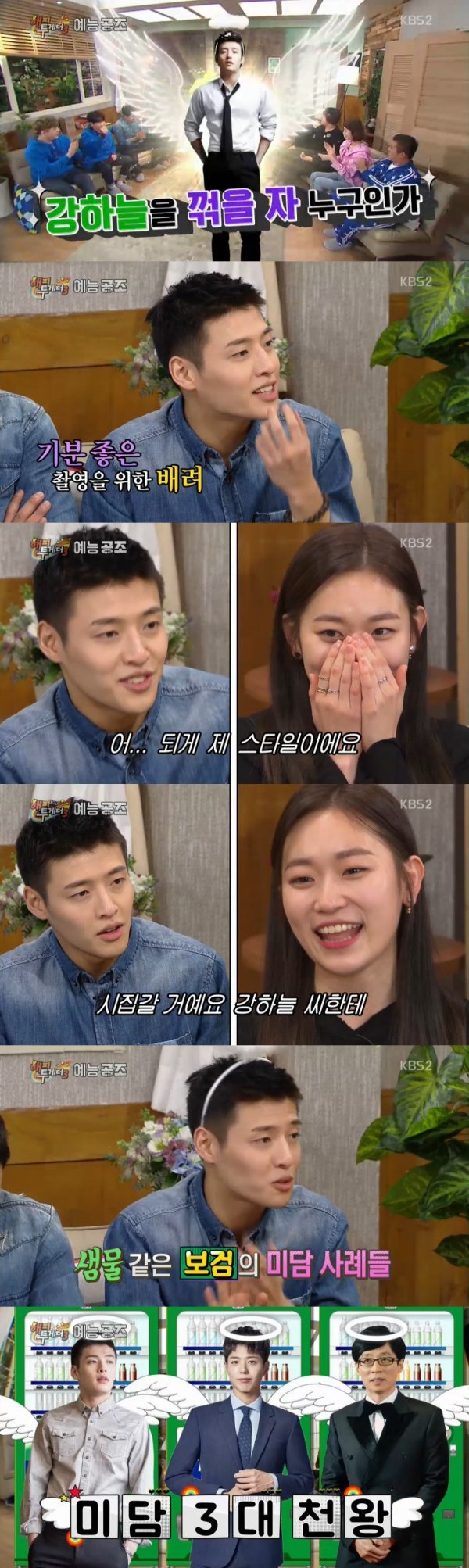 이날 강하늘은 ‘미담’ 뿐 아니라 ‘매력’을 자판에 깔고 펼치며 보여주기 시작했다. 김슬기가 함께 연기 호흡을 해보고 싶은 상대로 강하늘을 간접적으로 언급했고 MC들은 두 사람이 한 번 연기를 해보라고 재촉했다.