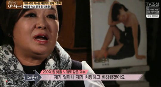 이에 혜은이는 “돈을 벌기 위해 악착같이 일했다. 돈 주는 곳이면 싫은 곳이라도 가서 노래를 했다”며 “너무 비참했다”고 말했다. 또 “빚 때문에 전 남편 사이의 딸을 데려올 수 없었다. 죽을 생각까지 했었다”고 눈물을 흘렸다.