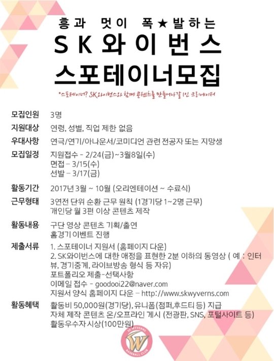 끼와 열정이 넘치는 팬이라면 누구나 '스포테이너'에 지원할 수 있다. 지원자는 구단 홈페이지(www.skwyverns.com)에서 지원서를 다운로드 해 내용을 작성한 후 자신이 제작한 UCC영상과 함께 이메일(goodooi22@naver.com)로 제출하면 된다.