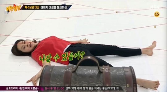 한채아는 특수요원으로 분해 레이저 장애물을 피해가면서도 19금 발언은 이어졌다. 한채아는 누워서 레이저 장애물을 지나다 고민에 빠졌다. 왠지 장애물에 닿을 것 같았기 때문. 멤버들은 “할 수 있을 것 같다”며 응원했지만 한채아는 “나 갈 수 있을까? 가슴이 너무 커서…”라고 말해 형님들을 또 한 번 당황하게 만들었다.