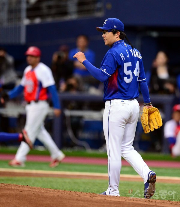 ‘2017 월드베이스볼클래식(WBC)’에 참가하는 한국 야구대표팀이 26일 고척스카이돔에서 쿠바와 2차 평가전을 가졌다. 선발 투수로 등판한 양현종이 3회말 첫 실점을 허용한 후 외야를 바라보고 있다.