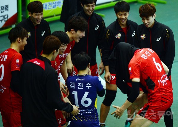 26일 수원실내체육관에서 ‘2016-2017 NH농협 V리그’ 수원 한국전력과 대전 삼성화재의 경기가 열렸다. 한국전력 방신봉이 가로막기를 성공시킨 뒤 댄스를 선보이고 있다.