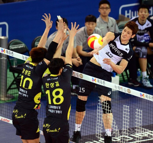1일 천안유관순체육관에서 열린 ‘NH농협 2016~2017 V리그’ 남자부 OK저축은행과 현대캐피탈 경기에서 현대캐피탈 문성민이 OK저축은행의 블로킹 사이로 스파이크 공격을 하고 있다.