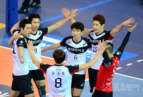 1일 천안유관순체육관에서 열린 ‘NH농협 2016~2017 V리그’ 남자부 OK저축은행과 현대캐피탈 경기에서 세트스코어 3-0 승리한 현대캐피탈 선수들이 기뻐하고 있다.