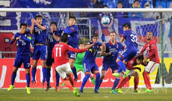 수원삼성은 1일 수원월드컵경기장에서 광저우 에버그란데(중국)와 2017 아시아챔피언스리그(ACL) G조 조별리그 2차전을 가졌다. 수원 선수들이 광저우의 프리킥을 수비하고 있다.