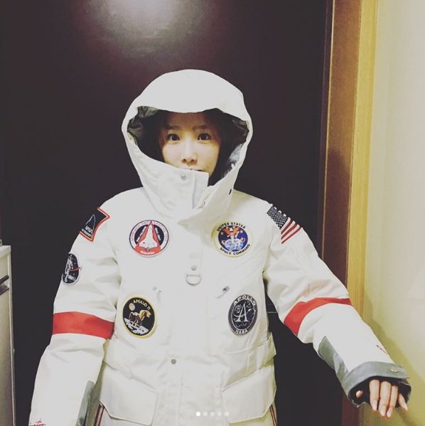 태연은 1일 자신의 인스타그램에 이색적인 복장을 한 사진 한장을 올렸다. 공개된 사진 속 태연은 우주복과 흡사한 흰색 패딩을 입고 다소 어색한 포즈를 취하고 있다.