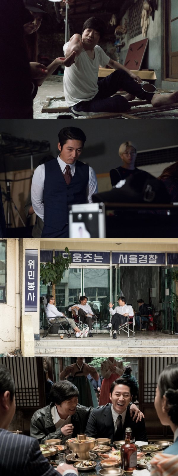 더불어 촬영 쉬는 시간, 담소를 나누며 웃고 있는 배우들의 스틸컷은 보통사람으로의 면모가 보이는 편안한 모습으로 관객들에게 한층 더 친근하게 다가간다. 한편, 극중 강렬하게 대립해 긴장감을 더할 성진과 규남 역의 손현주와 장혁은 함께 어깨동무를 하며 환하게 웃는 모습으로 배우 간의 완벽한 케미와 연기 호흡을 자랑함은 물론, 촬영 현장이 얼마나 훈훈했는지 짐작하게 한다.