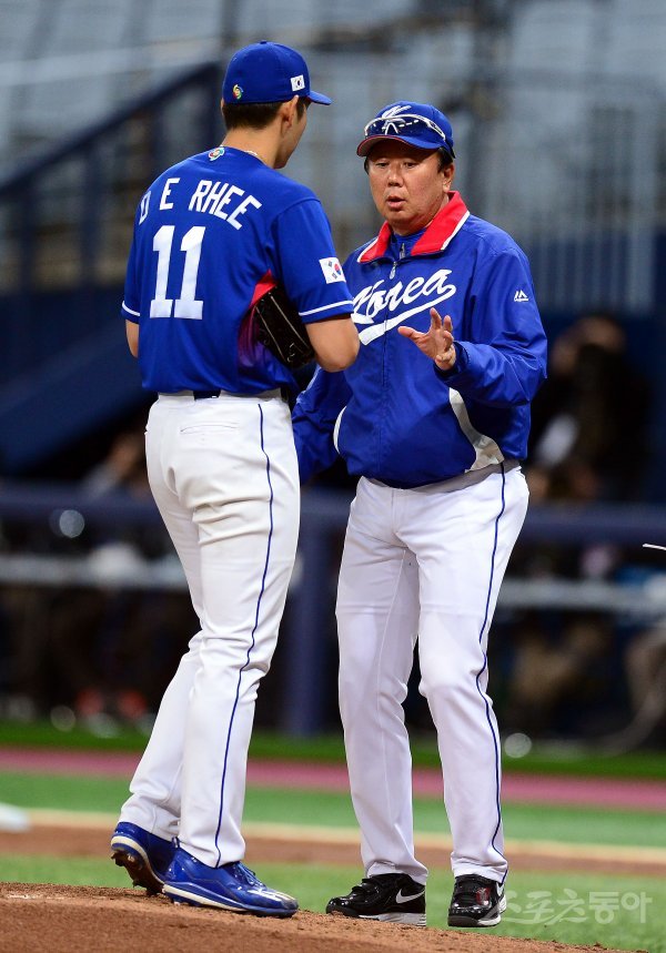 ‘2017 월드베이스볼클래식(WBC)’에 참가하는 한국 야구대표팀이 2일 고척스카이돔에서 상무와 서울라운드 시범경기을 가졌다. 2회말 2사 만루 상황에서 선동열 코치가 선발 투수 이대은은 교체시키고 있다.