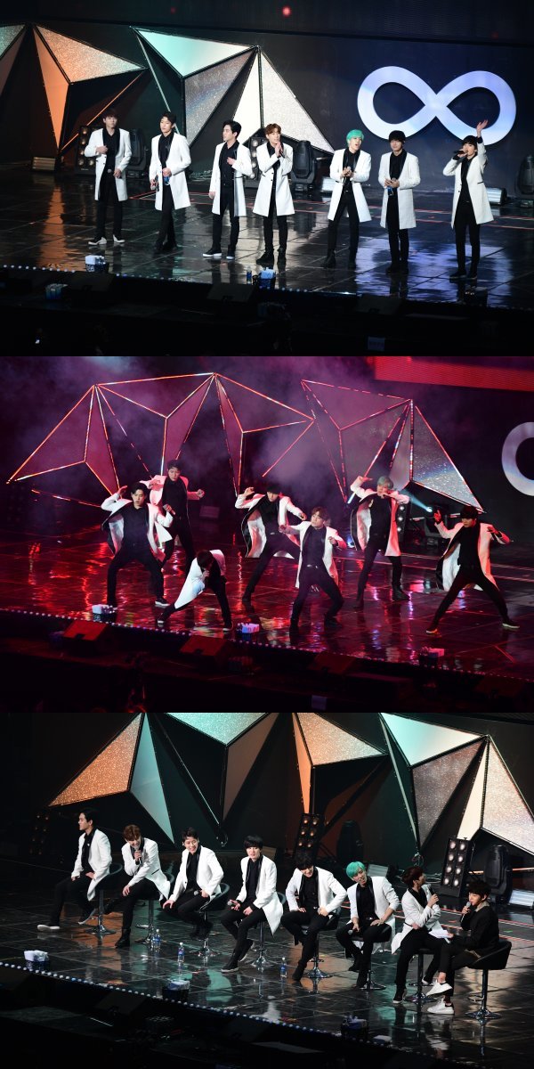 인피니트는 미니 5집 타이틀곡 ‘BAD’ 무대로 팬미팅을 시작했고 남우현은 “7년이라는 시간동안 ‘무한대집회’가 세 번째를 맞이하게 됐다. 환영한다”고 그룹을 대표해 인사했다. 이어진 토크에서 MC김민석은 출연 중인 SBS 월화드라마 ‘피고인’ 속 역할 이름인 성규를 언급하며 “성규를 연기 중이라 그런지 성규 형이 친근하게 느껴진다”고 말하며 분위기를 돋웠다. 하지만 멤버들은 MC 김민석의 읽는 듯한 진행을 꼬집으며 “인기가요 MC 같다” “당시 같이 했던 두 MC 공승연, 정연의 공백이 큰 거 같다”고 해 시작부터 웃음을 선사했다.