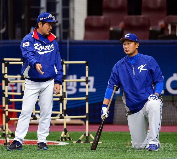 ‘2017 월드베이스볼클래식(WBC)’에 출전하는 한국 야구대표팀이 5일 고척스카이돔에서 훈련을 가졌다. 훈련 중 이순철 코치가 이대호와 이야기 하고 있다.