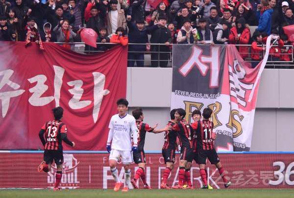 5일 서울월드컵경기장에서 KEB 하나은행 K리그 클래식 2017 1라운드 FC서울과 수원삼성의 경기가 열렸다. 후반 FC서울 이상호(오른쪽 두 번째)가 동점골을 성공시킨 후 동료들의 축하를 받고 있다.