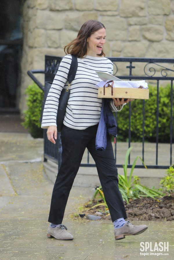 제니퍼 가너는 스트라이프 티셔츠와 남색 면바지의 평범한 옷차림으로 한손에는 종이 박스를 들고 환하게 웃고 있다.
