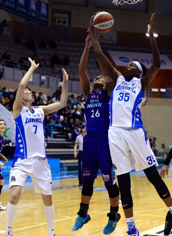 6일 아산 이순신체육관에서 열린 ‘삼성생명 2016-2017 여자프로농구’ 아산 우리은행과 용인 삼성생명의 경기에서 우리은행 존스와 삼성생명 토마스가 리바운드를 다투고 있다.