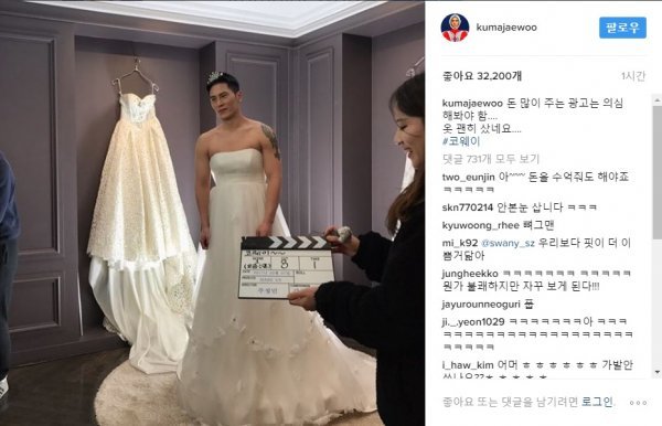 사진 속 김재우는 구릿빛 근육질 몸매와 대조되는 순백의 웨딩드레스를 입고 있다. 그는 멀리 허공을 응시하고 있으며, 타이트한 웨딩드레스가 불편해 보이는 표정을 짓고 있다.