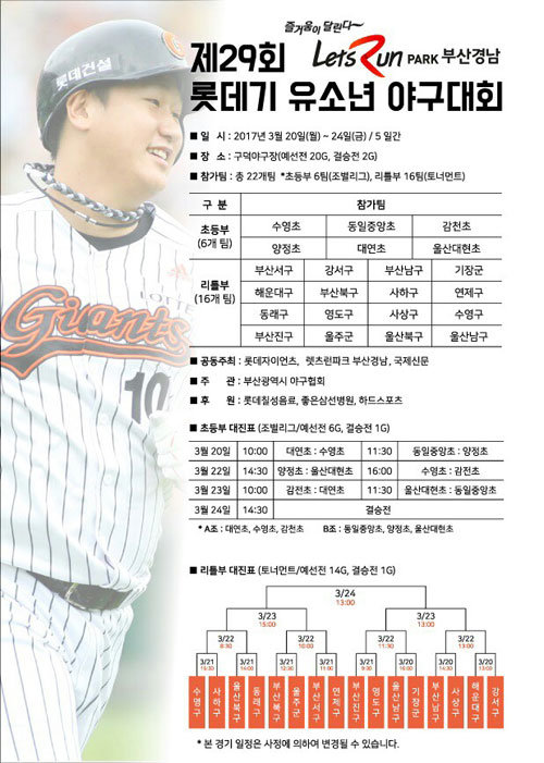 롯데 자이언츠는 "20일부터 24일까지 구덕야구장에서 제 29회 렛츠런파크 부산경남 롯데기 유소년 야구대회를 개최한다"고 8일 밝혔다.