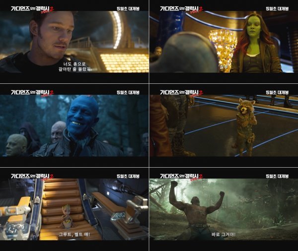 은하계의 수호자, ‘스타로드’, ‘가모라’, ‘드랙스’, ‘로켓’과 관객들의 기대와 사랑을 한 몸에 받고 있는 ‘베이비 그루트’를 비롯, 새롭게 가디언즈 팀에 합류하게 된 ‘맨티스’(폼 클레멘티에프), ‘네뷸라’(카렌 길런), ‘욘두’(마이클 루커), ‘스타로드’의 아버지 ‘에고’(커트 러셀)까지 더욱 풍성해진 캐릭터들과 압도적으로 커진 스케일의 액션으로 뜨거운 기대를 모으고 있는 ‘가디언즈 오브 갤럭시 VOL. 2’는 2017년 5월초 관객들을 찾아갈 예정이다.