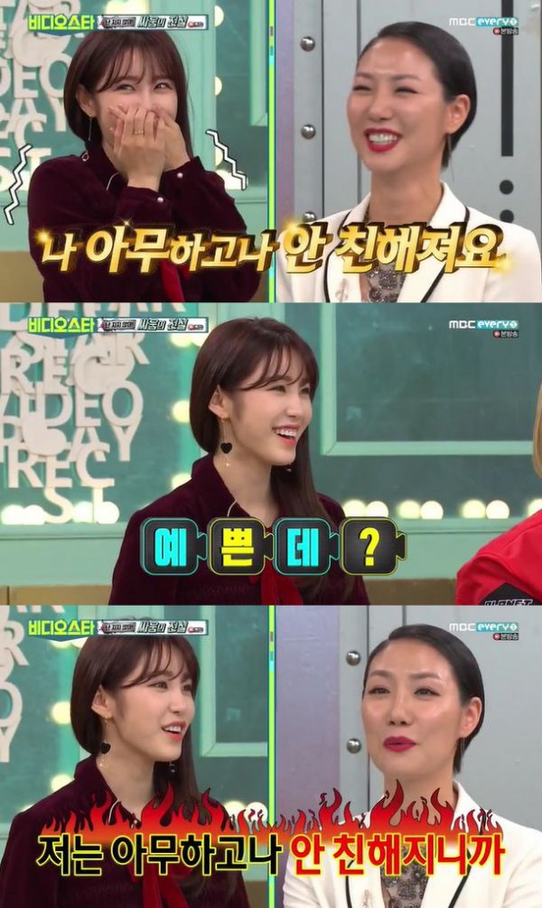 이어 비키는 당황한 전효성에게 “몸매도 정말 예쁘고 뮤직비디오도 찾아봤지만, 저는 아무하고나 안 친해지니까”라며 다시 한번 단호한 대답을 하여 촬영장을 폭소케 했다.
