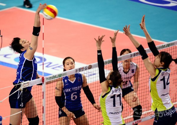 8일 경기도 화성종합실내체육관에서 ‘2016-2017 NH농협 V리그’ 화성 IBK기업은행과 수원 현대건설의 경기가 열렸다. IBK기업은행 김희진이 현대건설 블로커를 피해 스파이크를 날리고 있다.