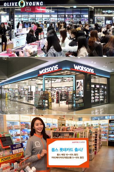 ‘드럭스토어’ 전성시대다. 지난해 시장규모가 매출 1조2000억대로 급성장하면서 CJ·GS·롯데·신세계 등이 진출해 ‘대기업 빅뱅’으로 이어지고 있다. (맨위부터) CJ ‘올리브영’ 명동 본점에서 쇼핑하고 있는 고객들, GS ‘왓슨스’ 외부 전경, ‘롭스 롯데카드’를 소개하고 있는 모델. 사진제공 l 올리브영·GS리테일·롯데카드