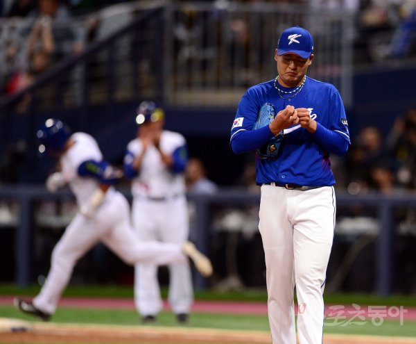 한국 WBC대표팀이 9일 고척스카이돔에서 ‘2017 월드베이스볼클래식(WBC)’ 예선 1라운드 3차전 대만과 경기를 가졌다. 4회말 1사 1루 심창민이 대만 린저슈엔에게 좌월 투런 홈런을 허용한 후 고개를 떨구고 있다.
