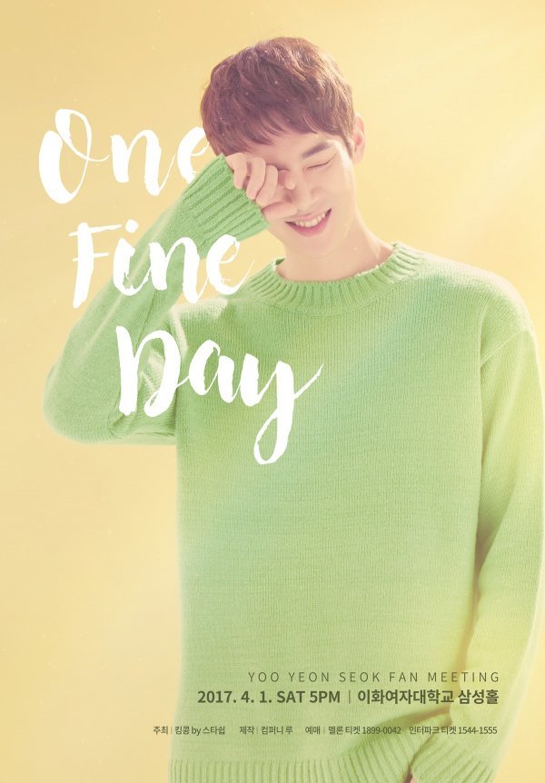 4월 1일 오후 5시 이화여자대학교 삼성홀에서 개최되는 유연석의 팬미팅은 ‘One Fine Day’라는 타이틀로 진행된다. 티켓은 14일 저녁 8시부터 멜론티켓과 인터파크를 통해 예매가 가능하다.