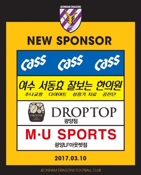 프로축구 K리그 클래식 전남드래곤즈(사장 신승재)가 홈 개막전을 앞두고 경기장을 찾는 팬들에게 다양한 팬 서비스를 제공하기 위해 오비맥주, 여수 서동효 잘보는 한의원, M.U 스포츠 광양LF아울렛점, DROPTOP 광양점과 경품 후원 협약을 체결했다.