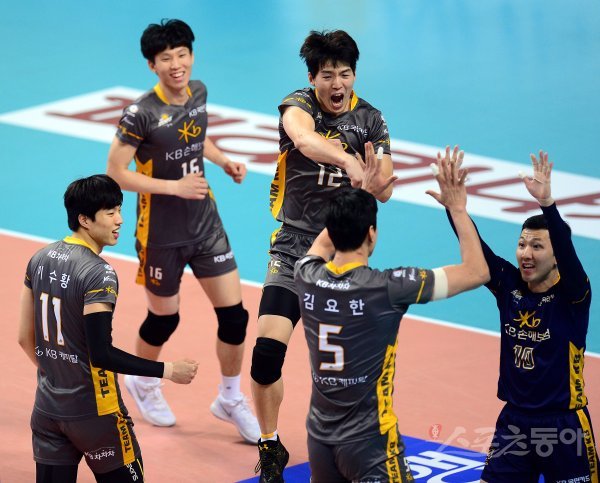12일 서울 장충체육관에서 열린 ‘NH농협 2016~2017 V리그’ 남자부 KB손해보험과 우리카드 경기에서 KB손해보험 김요한이 득점에 성공한 후 황두연(12번), 곽동혁과 기뻐하고 있다.