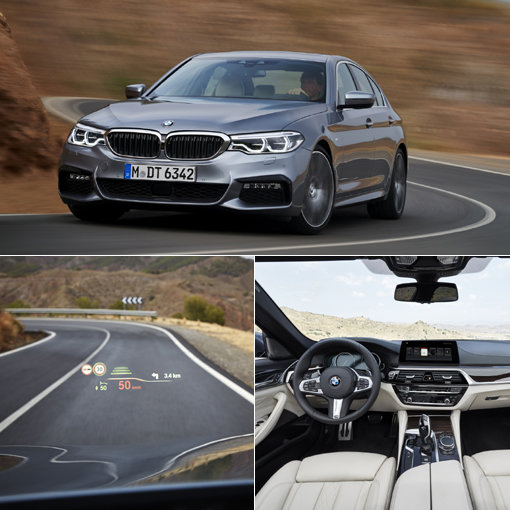 독보적인 드라이빙 능력을 자랑하는 BMW 뉴 5시리즈는 부드럽고 정확한 코너링이 가능한 프리미엄 비즈니스 세단이다. 새로운 엔진으로 연료 효율성을 높였고, 전 모델에 기본 탑재한 반자율주행기술로 안전성을 더욱 강화했다. BMW 뉴 5시리즈 헤드업 디스플레이(오른쪽 위)와 실내 인테리어(오른쪽 아래). 사진제공|BMW코리아