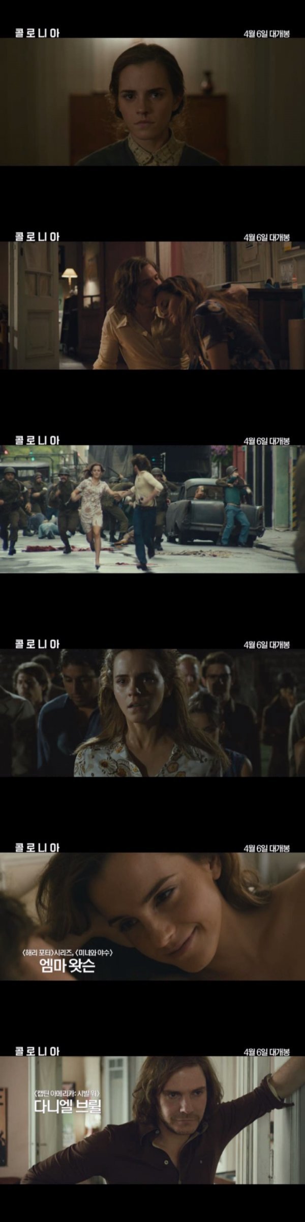 사랑을 위해 목숨을 건 엠마 왓슨 사투, 그리고 그 이전에는 볼 수 없었던 엠마 왓슨의 색다른 변신과 다양한 매력을 볼 수 있는 강렬한 티저 예고편을 공개해 기대를 모으고 있는 ‘콜로니아’는 4월 6일 개봉한다.