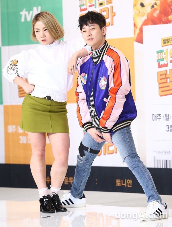 개그우먼 박나래(왼쪽), 가수 딘딘이 13일 오전 서울 영등포구 타임스퀘어에서 열린 케이블채널 tvN \'편의점을 털어라\' 제작발표회에 참석해 포토타임을 하고 있다.