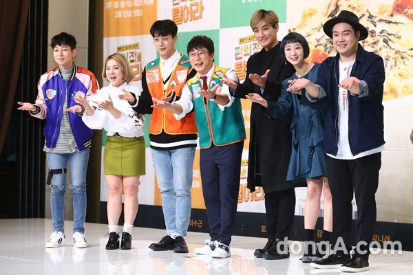가수 딘딘(왼쪽부터), 개그우먼 박나래, 가수 윤두준, 개그맨 이수근, 가수 강타, 혜린, 작곡가 유재환이 13일 오전 서울 영등포구 타임스퀘어에서 열린 케이블채널 tvN \'편의점을 털어라\' 제작발표회에 참석해 포토타임을 하고 있다.