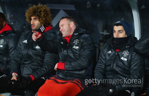 진지한 모습의 마루앙 펠라이니(맨 왼쪽)와 헨리크 미키타리안(맨 오른쪽), 웃고 있는 웨인 루니(가운데). ⓒGettyimages이매진스