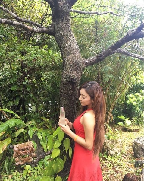 공개된 사진 속 루나는 나무가 우거진 숲에서 화장품을 들고 서 있다. 루나는 몸에 착 달라붙는 빨간색 원피스로 건강미를 발산했다.