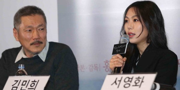 배우 김민희(오른쪽)가 13일 오후 서울 건대 롯데시네마에서 열린 영화 ‘밤의 해변에서 혼자’ 언론시사회에 참석해 인사말을 하고 있다.