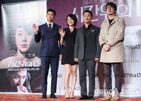 14일 오전 서울 광진구 건대입구 멀티플렉스관에서 열린 영화 시간 위의 집 제작보고회에서 배우 옥택연, 김윤진, 조재윤, 감독 임대웅(왼쪽부터)이 포토타임을 하고 있다.