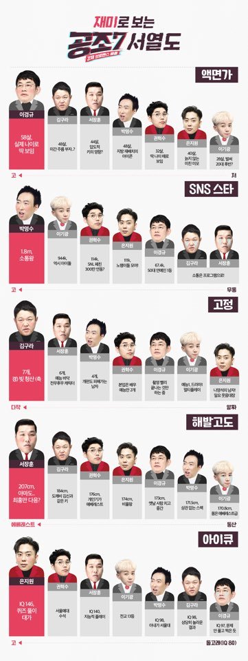 14일 ‘공조7’ 페이스북에는 이경규, 김구라, 박명수, 은지원, 서장훈, 권혁수, 이기광 등 MC들을 각 분야에 맞춰 서열을 정리해 놓은 표가 공개됐다.