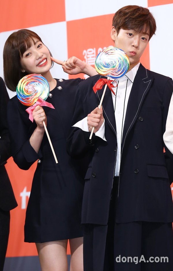 레드벨벳의 멤버 조이(왼쪽), 배우 이현우가 14일 오후 서울 강남구 임피리얼팰리스호텔에서 열린 케이블채널 tvN 월화드라마 \'그녀는 거짓말을 너무 사랑해\' 제작발표회에 참석해 포토타임을 하고 있다.