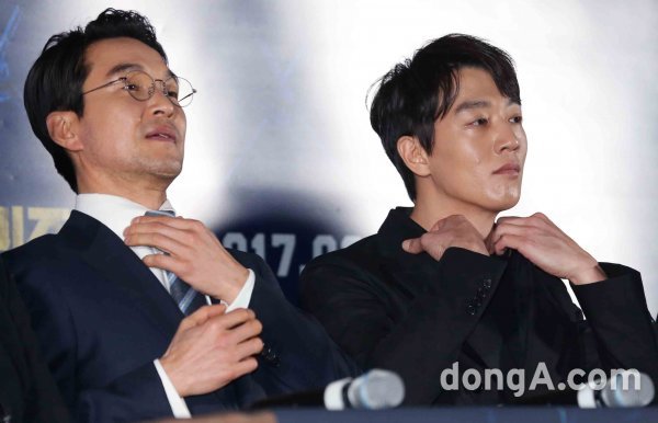 배우 한석규(왼쪽)과 김래원이 14일 오후 서울 동대문 한 멀티플렉스관에서 열린 영화 프리즌 언론배급시사회에 참석하고 있다.
