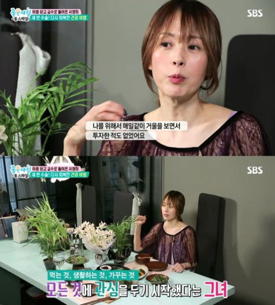 이날 서정희는 이혼과 세 번의 수술 등 여러 가지 위기를 이겨 낸 가슴 아픈 고백을 털어놓으며 “나를 위해 밥상을 차려본 적도 거울을 보면서 투자한 적도 없었다”며 “혼자 살면서 나를 돌아보고 아끼고 확인하고 전반에 걸쳐서 관심을 갖게 됐다. 100년은 너끈히 젊음을 유지하고 살 수 있을 것 같다”고 전했다.