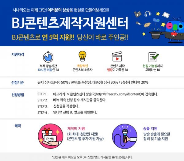BJ콘텐츠제작지원센터는 △신인 BJ 방송콘텐츠 개발 △방송 예산 △방송홍보까지 전 과정을 아프리카TV가 지원한다. 누적 방송시간이 10시간 이상인 BJ라면 지원할 수 있다. BJ를 꿈꾸는 모든 이들에게 열려있는 정책으로 신입BJ를 포함한 일반BJ와 베스트BJ가 대상이다. 아프리카TV는 연간 총 5억원의 비용을 지원하겠다고 밝혔다.